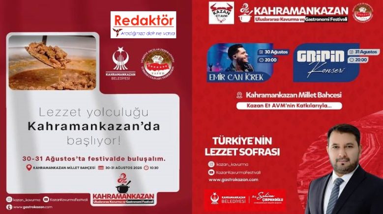 Kahramankazan Uluslar arası Kavurma ve Gastronomi Festivali 31 Ağustos Pazar günü etkinliklerle devam edecek. Gün boyunca çeşitli kutlamaların ve etkinliklerin yer aldığı festival akşam Saat 20.00 da GRİPİN konseri ile son bulacak.